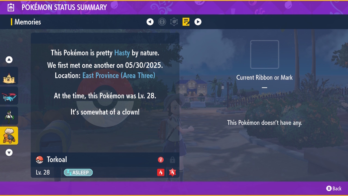 2025-06-23 #119 色違いコータス 東3番エリアの大量発生その8 大量発生以外色粘りが難しいと先延ばしにしていたコータスをサブロムで粘る 手乗りコーちゃん 今回の大量発生の場所はここ キャンプリセットの場所から反時計回りに撮影 コータスのサイズは大きいものの近くに出てくれないので見かけは小さくなってしまう 出現 色違いは黄色っぽい 捕獲へ 今回も2言語対応 証なし 結果 520匹リセット後に出現 次回 初見で顔が引きつった人が多そう…